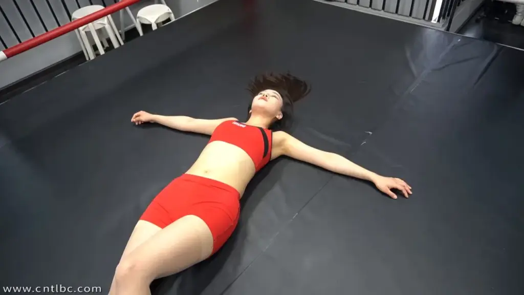 Watch two Asian women engage in intense wrestling match in a ring, with moments of choking and submission.