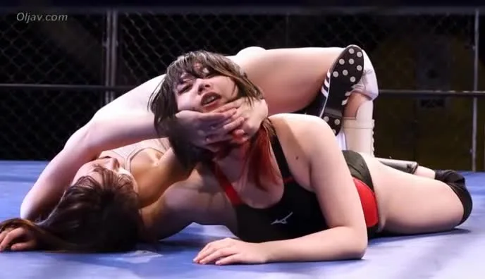 Watch two Asian women engage in intense wrestling match in a ring, wearing sports bras and shorts, with various grappling poses