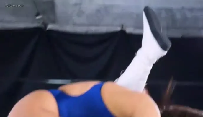 Watch two Asian women engage in intense wrestling match wearing blue and red swimsuits in a dimly lit wrestling ring.