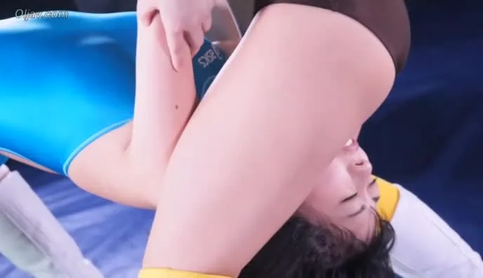 Watch two slim Asian women engage in intense wrestling and sensual moments in a wrestling ring, dressed in blue and black swimsuits.