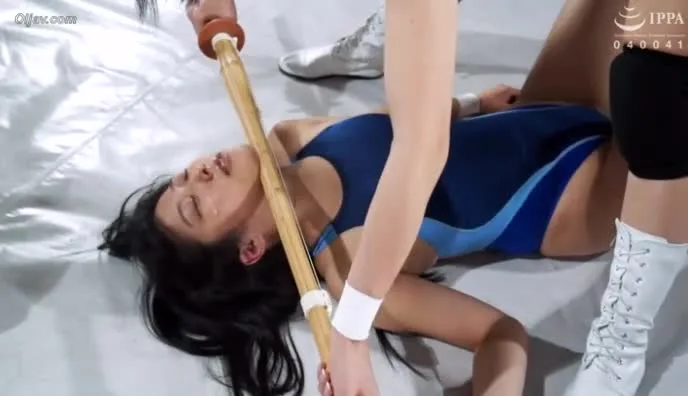Watch intense wrestling match between slim Asian women in swimsuits, featuring close-ups and wide shots in a wrestling ring