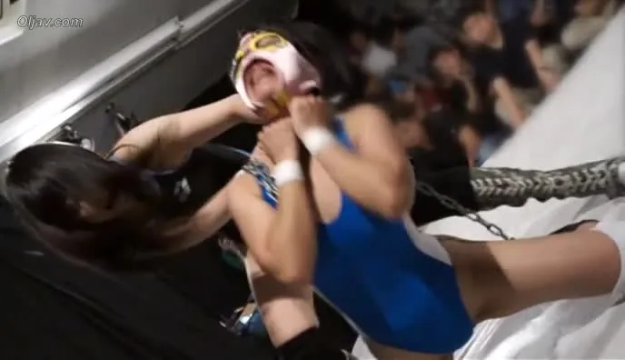 Watch two Asian women engage in intense wrestling matches, wearing wrestling attire in a dimly lit ring.