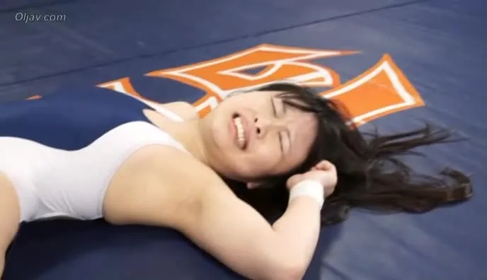 Watch two Asian women engage in a fierce wrestling match, wearing wrestling outfits in a ring with blue mat and orange logo