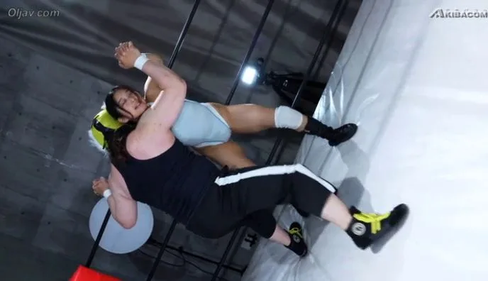 Watch intense wrestling match between Asian male and female wrestlers with ponytail hair style and white wristbands in an indoor wrestling ring