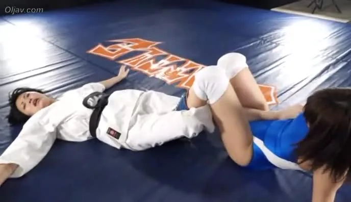 Watch two Asian performers engage in a sensual wrestling match, with a dominant woman in a blue leotard and a muscular man in a white karate uniform.