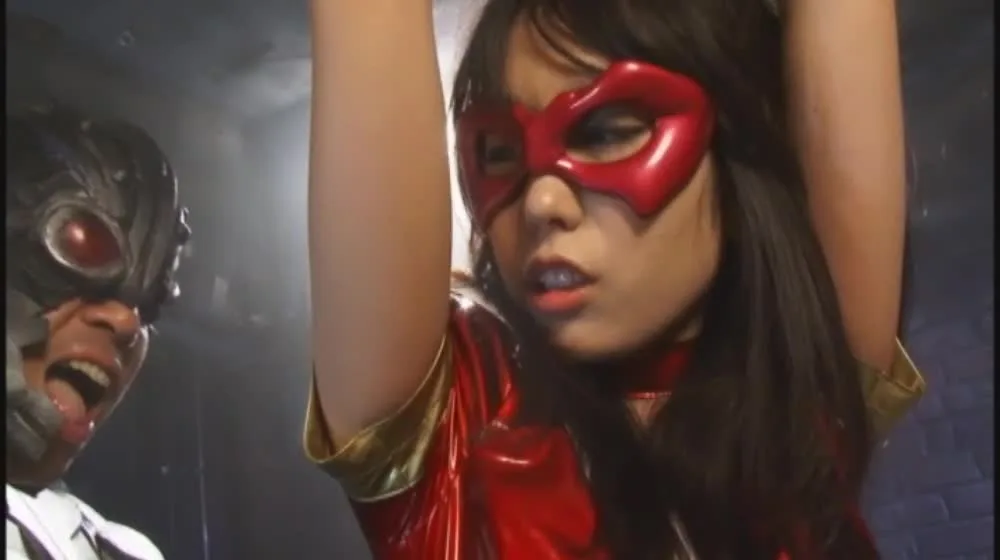 Watch intense wrestling scene with masked Asian performers in red dress and black costume, set in industrial and theater settings