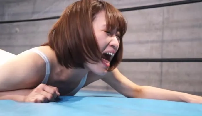 Watch two Asian females engage in an intense wrestling match, wearing white bikinis and boots on a blue mat.