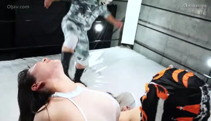 Watch three Asian wrestlers, two female and one male, engage in a fierce match in a brightly lit wrestling ring, wearing white bodysuits.