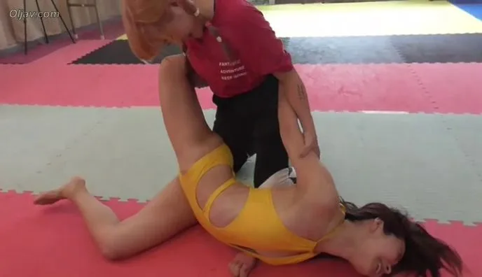 Watch two Asian women engage in intense wrestling matches in a bright gym, wearing yellow bodysuits and red shirts.