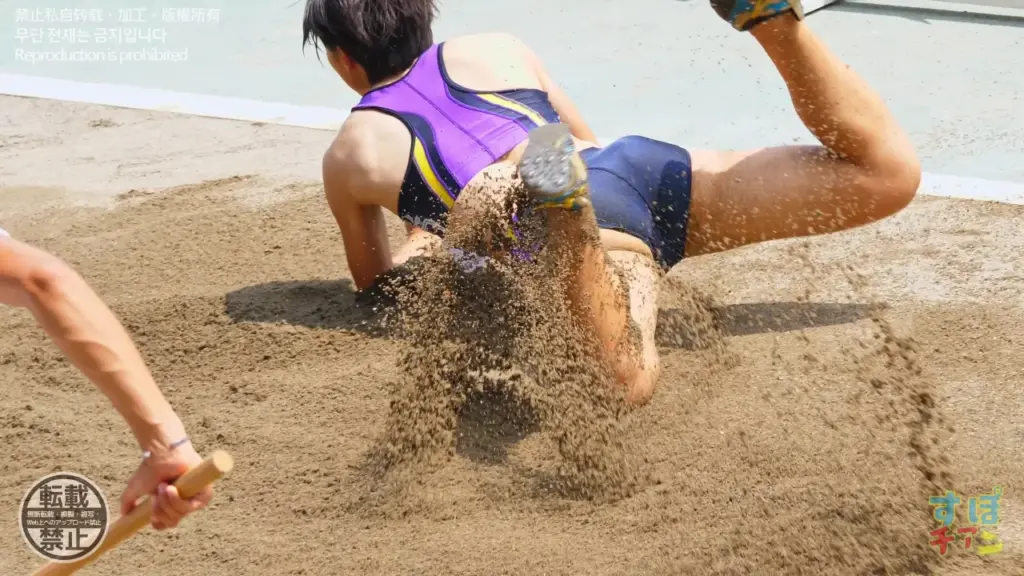 Watch athletic Asian performers in swimsuits competing at track and field events, featuring hurdles and long jump pit action