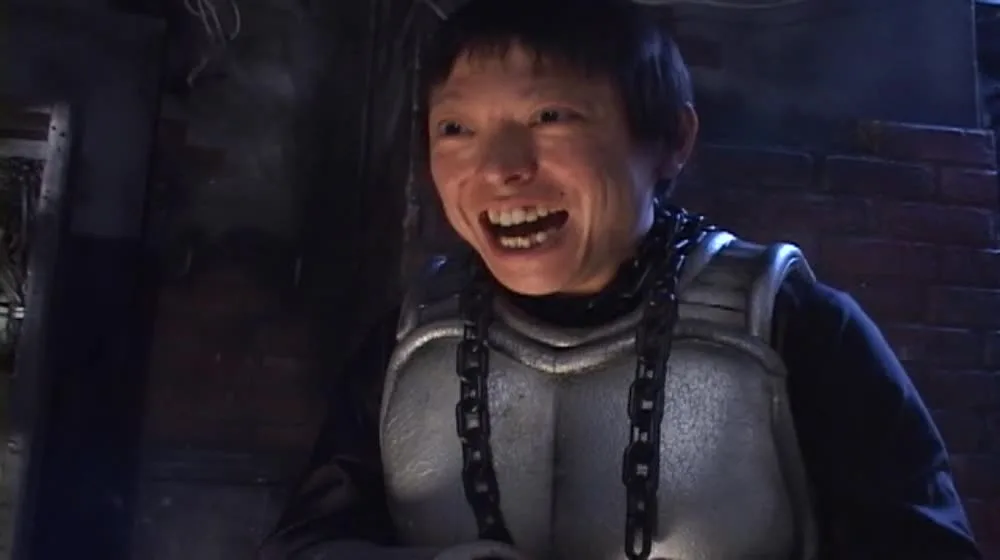 Watch a black woman dressed as a superheroine in a dimly lit warehouse, engaging in intense scenes with a muscular man in silver armor