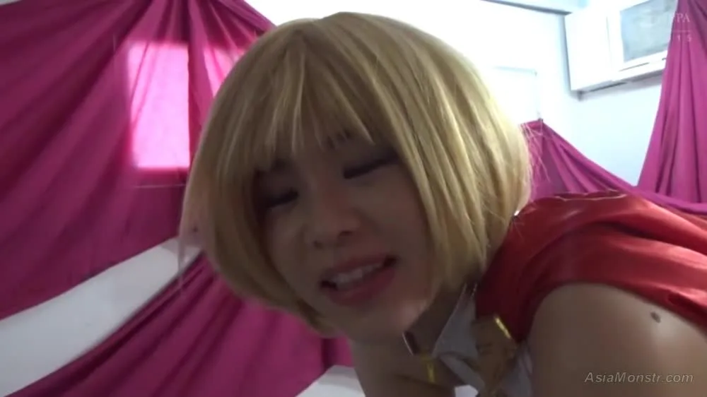 Watch a blonde Asian cosplayer in a red cape and white costume get handled and intimate in a theatrical setting