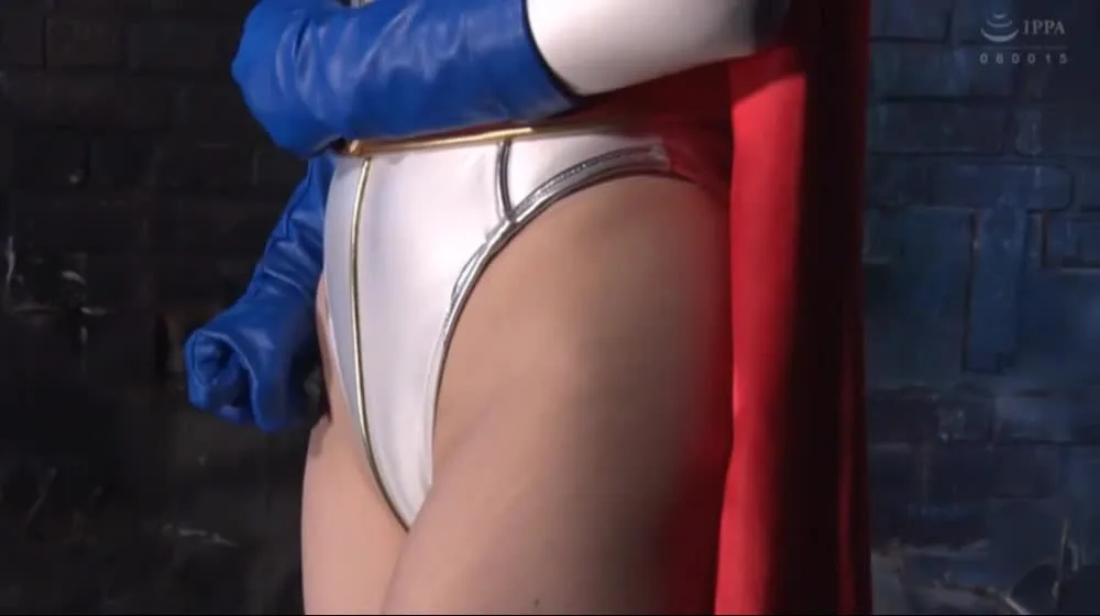 Watch a blonde Asian woman in a white bodysuit and red cape engage in various poses in an industrial setting with dim lighting.