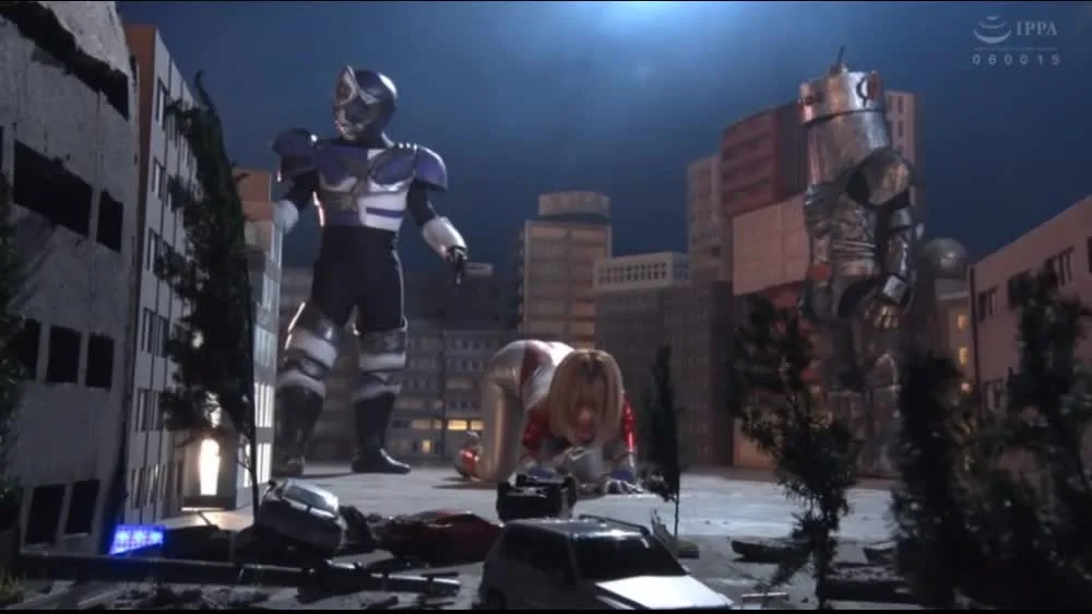 Watch a blonde Asian woman in a metallic costume battle robotic figures in a futuristic cityscape at night