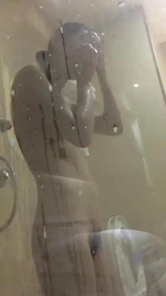 Watch a stunning blonde beauty shower and wash her hair in a steamy bathroom, captured in POV.