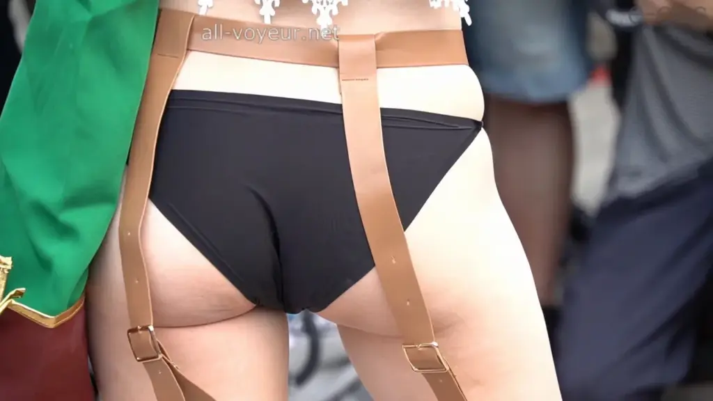 Watch a blonde Asian cosplayer in a pink bikini and white furry accessory posing outdoors in a crowd