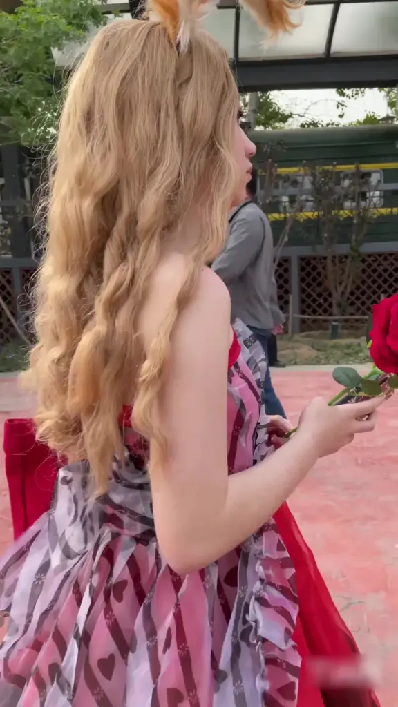 Watch a blonde woman in stockings and bunny ears enjoying the outdoors in a dress, in a series of sensual shots