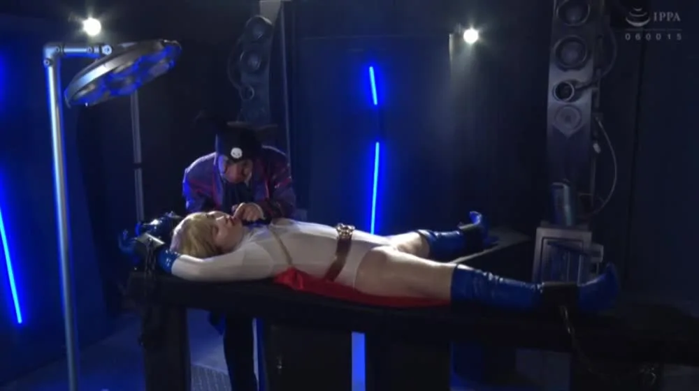 Watch a blonde woman in a white costume and red cape in a dimly lit stone-walled room, with various props and settings, including a medical or laboratory equipment