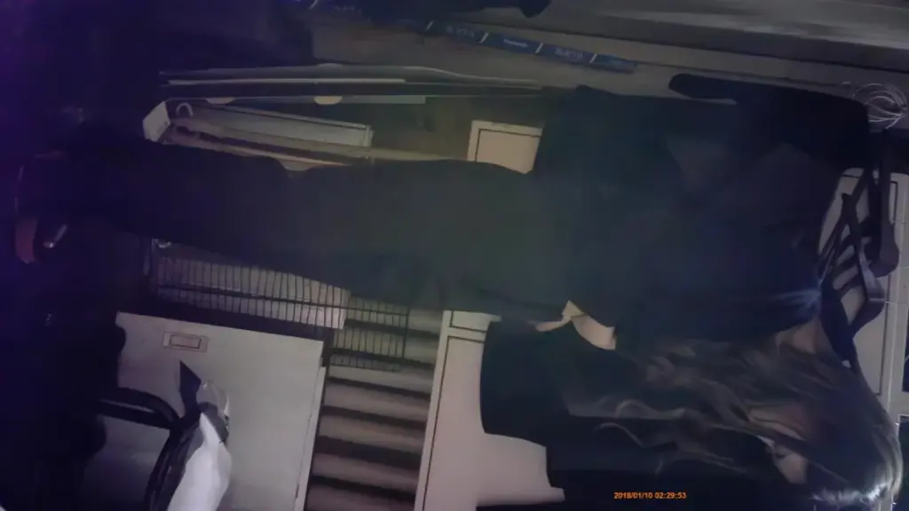 Watch a blonde woman in her 20s masturbate in a dimly lit office, captured in wide shot from a high angle.
