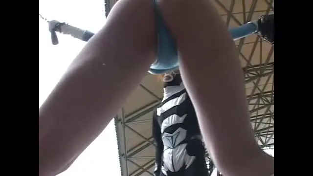 Watch a Caucasian female performer in her 20s with long brown hair perform aerial stunts in a blue costume on a stage with metal grating and scaffolding.