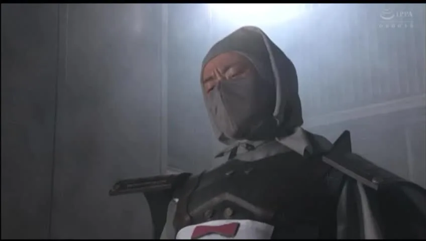 Witness the intense scene of a woman restrained, wearing a red mask, and being held by a dominant figure.