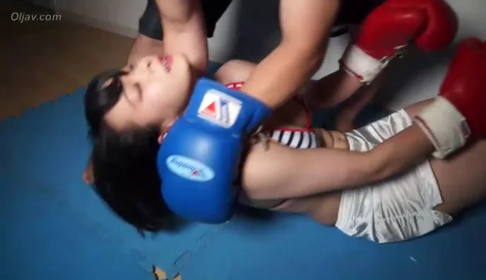 Watch a young couple engage in a sensual boxing match on blue mats, wearing boxing gloves and revealing attire.