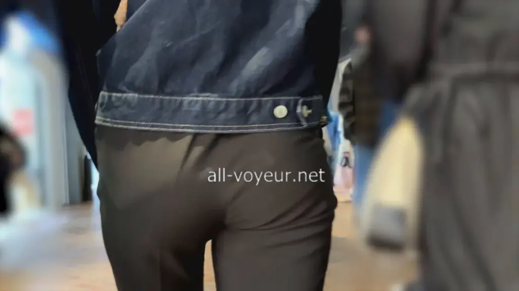 Watch a slim, long-haired brunette teen browse clothing store, captured in low-angle shots