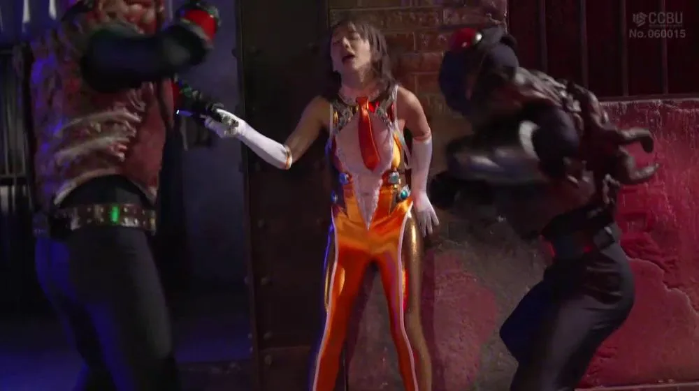 Watch a slender brunette in an orange and white costume being restrained by male figures in a dark indoor setting.