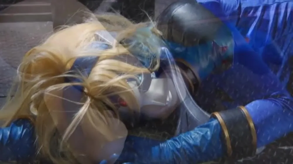 Watch cartoon characters in provocative costumes and bodysuits engage in intense fights and intimate moments in a dimly lit warehouse setting.