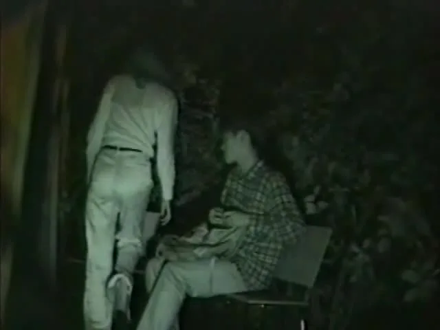 Watch a young couple embracing and kissing in a garden or patio at nighttime, captured on a hidden camera.