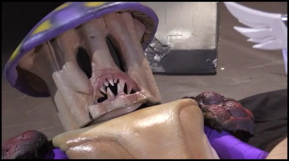 Watch a young couple in colorful costumes engage in intimate moments in a bedroom with black sheets.
