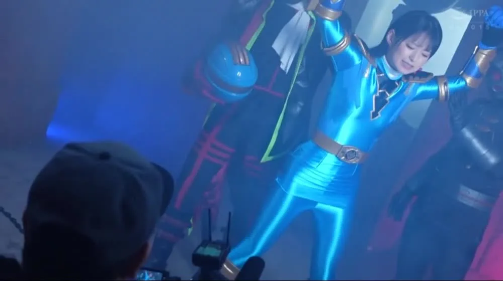 Watch an intense scene with performers in dynamic poses, featuring a helmeted figure and a dramatic interaction