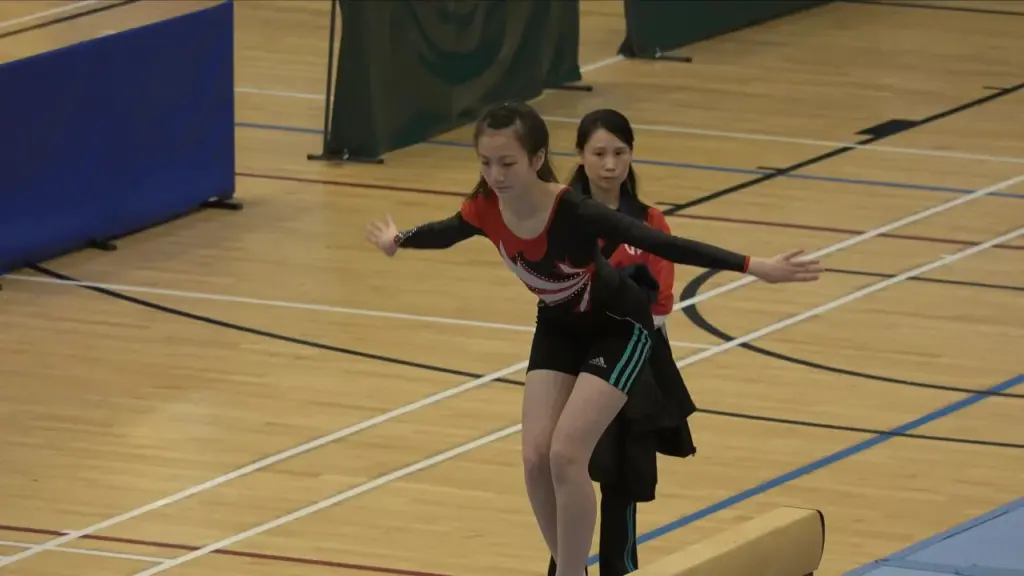 Watch athletic teens in leotards perform gymnastics routines in an indoor gymnasium