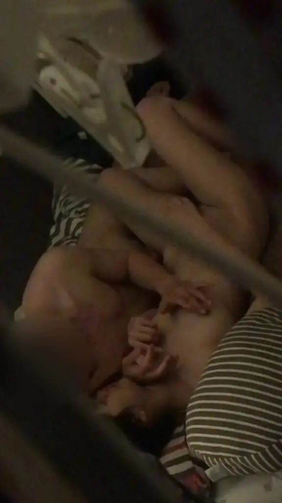 Watch a shirtless male and a female in a black and white striped top in an intimate bedroom setting with dim lighting and striped bedding.