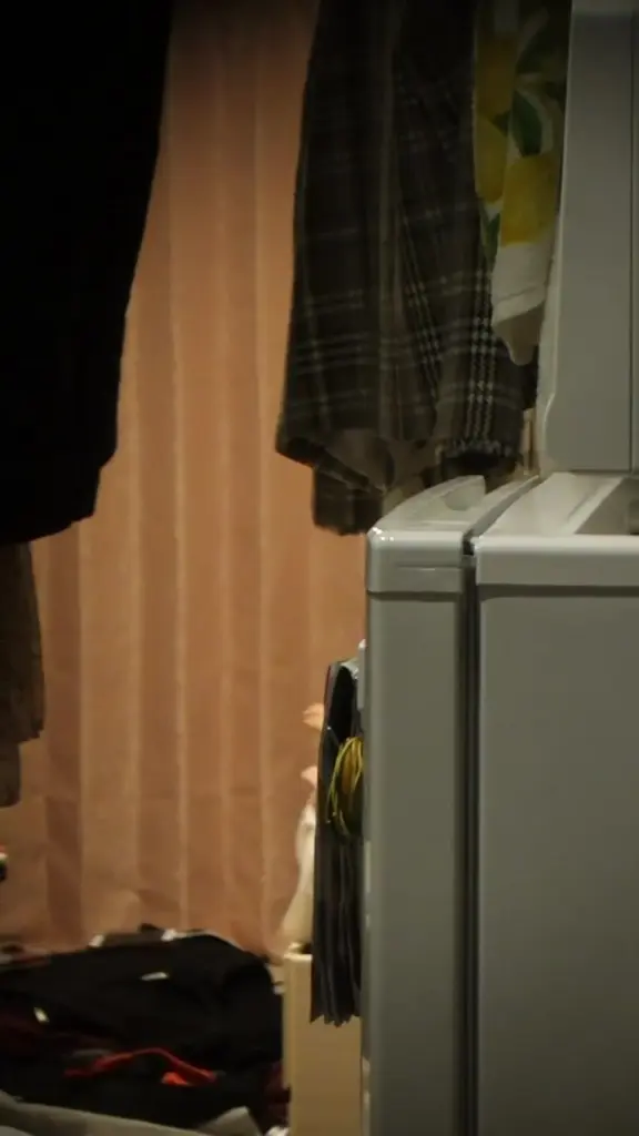 Watch a slim Caucasian man in his 20s hiding and seducing in a dimly lit laundry room with washing machine and clothes.
