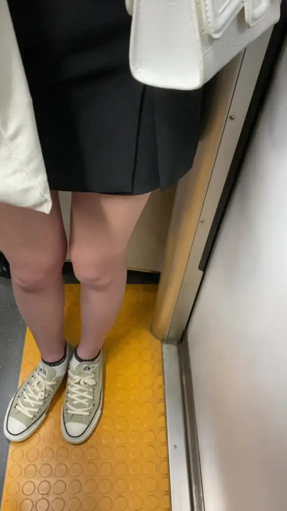 Watch a high-angle shot of legs standing on a yellow mat in a subway or train. Intimate and explicit content.