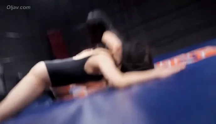 Watch two young women with black hair engage in an intense wrestling match, wearing black and striped swimsuits, in a dark indoor arena