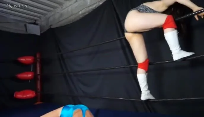 Watch intense female wrestling match with dark-haired performers in blue and leopard-print attire