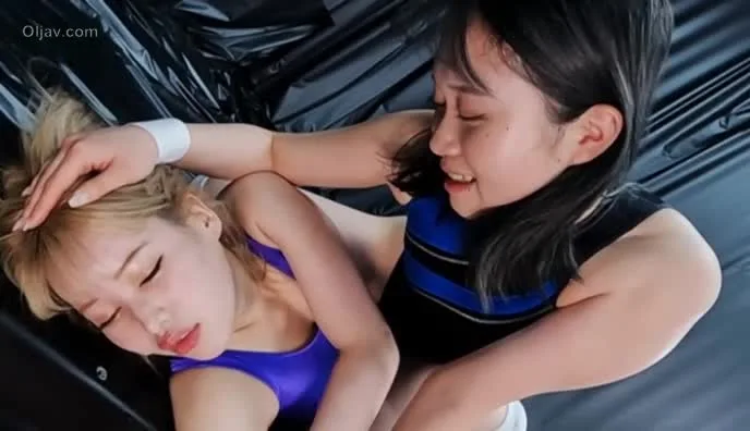 Watch intense wrestling match between 2-3 women in leotards, featuring pinning, choking, and more in a studio setting