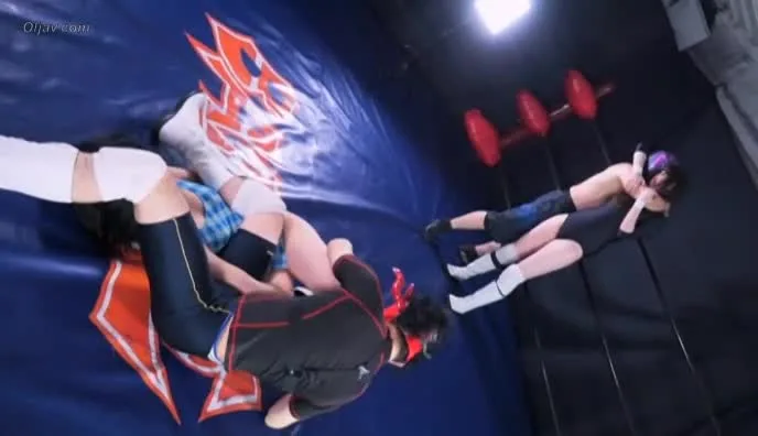 Watch four women wrestle in a ring, showcasing their athletic bodies and tattoos in an intense match.