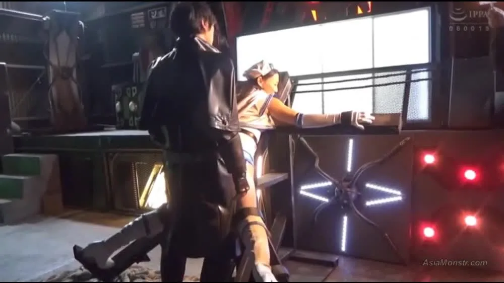Watch a masked couple engage in intimate moments in an industrial setting with dramatic lighting and futuristic decor