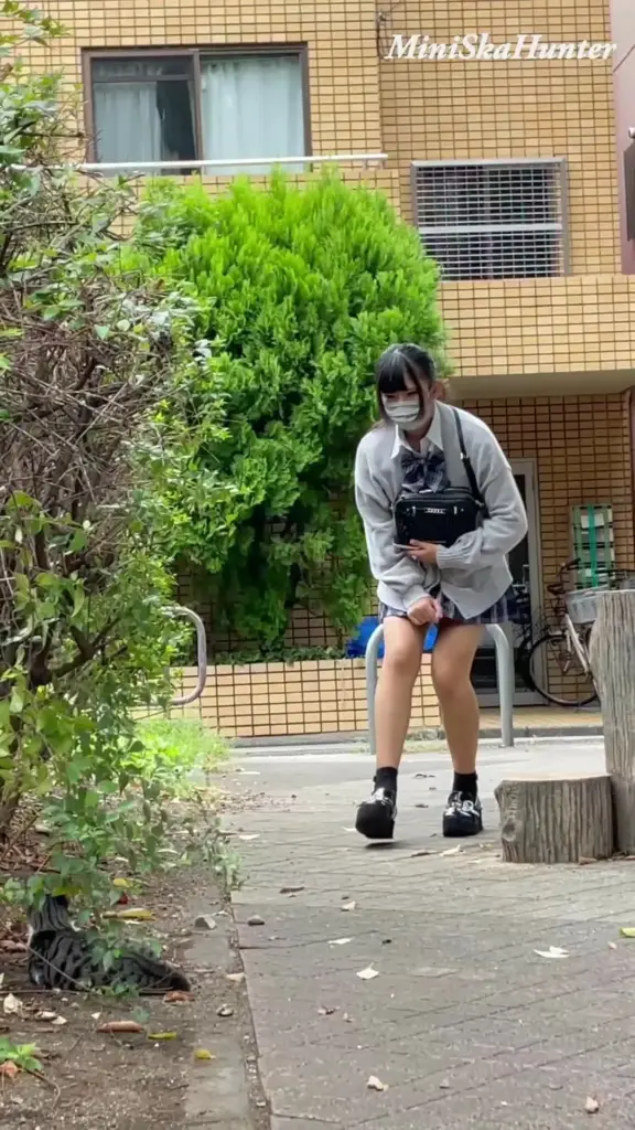 Watch a mysterious masked girl expose her thighs and masturbate while sitting on a bench, captured in close-up POV