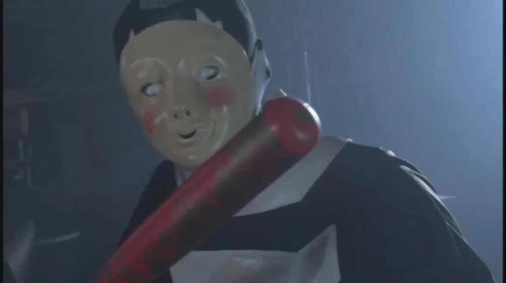 Watch a fair-skinned woman in a red mask with yellow goggles and white fur trim stand topless in front of a man. More masked and topless scenes inside.