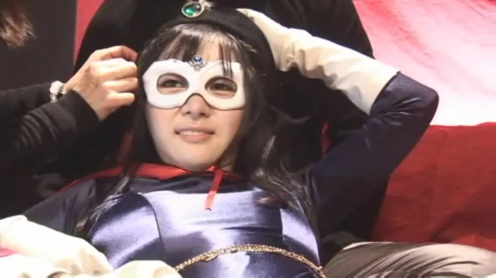 Watch a masked woman in a dramatic pose, sword in hand, in this intense scene captured with dynamic camera angles