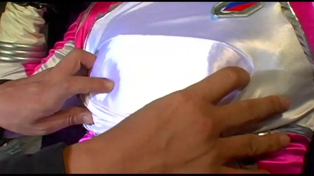 Watch as a woman in a shiny metallic costume is restrained and seduced in a dark, intense setting.