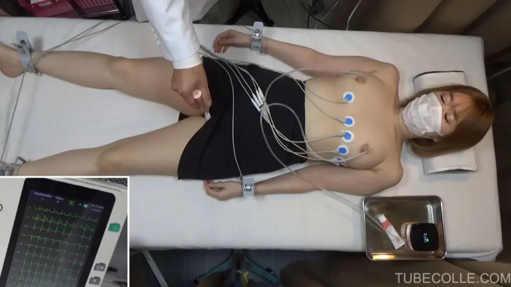 Watch a redheaded woman in her 20s undergo a medical examination in a brightly lit room with ECG electrodes attached to her body