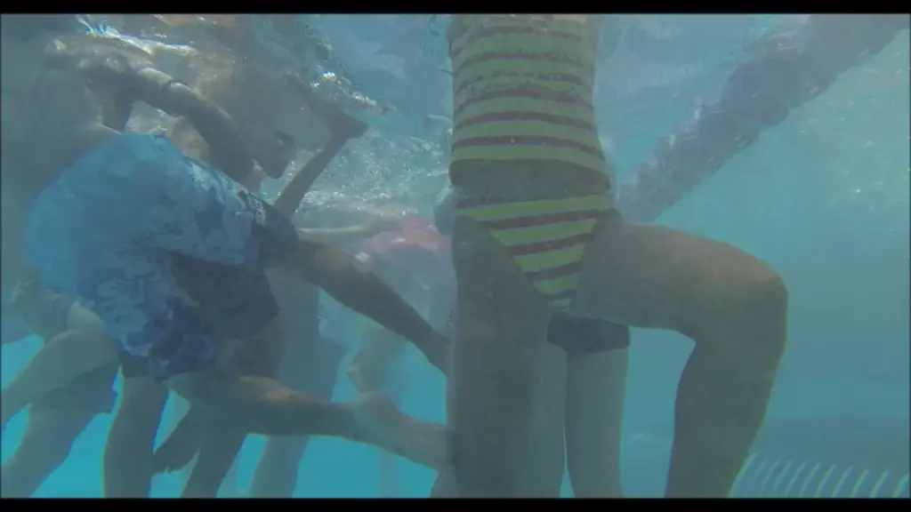 Watch three slim Caucasian babes enjoying a sensual swim together in a pool, captured in close-up and wide shots.