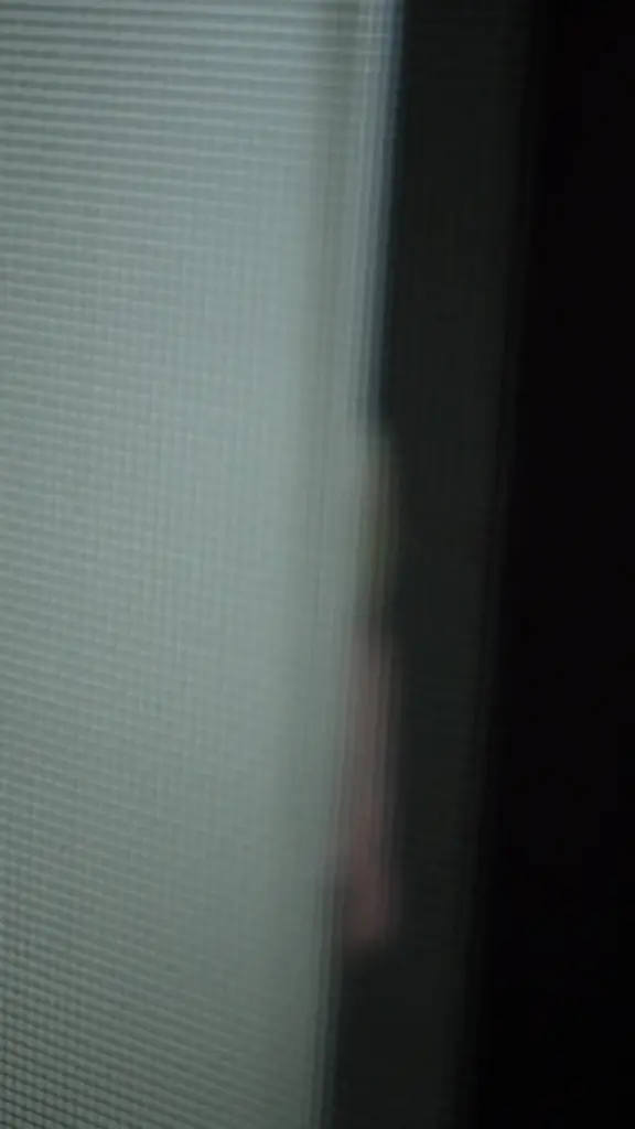Watch a slim Caucasian woman in her 20s in a bedroom setting, captured through window blinds and door frames.