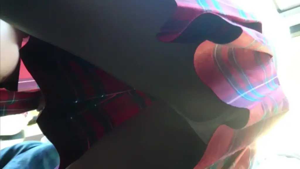 Watch a young, slim Caucasian girl in her 20s expose her belly and lift her red plaid skirt in a train or bus setting with natural light.