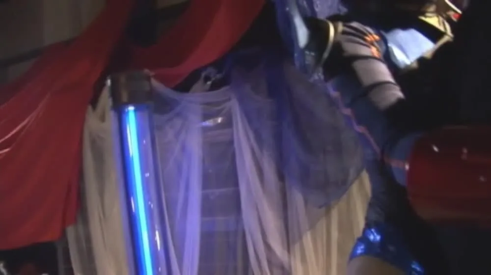 Watch a woman being assisted with her costume and posing suggestively with blue lighting and off-camera interaction